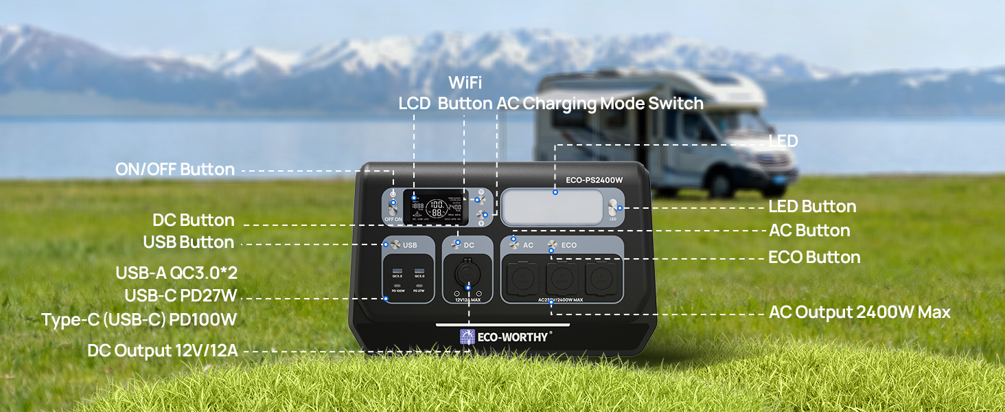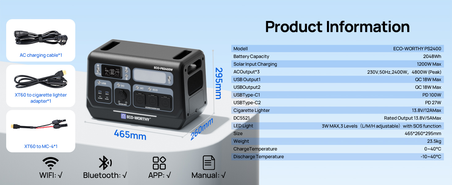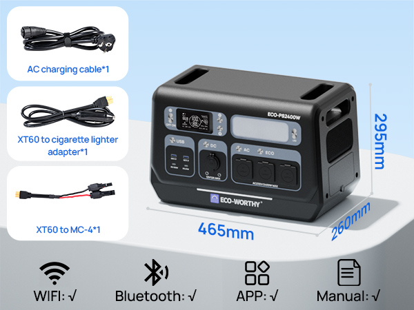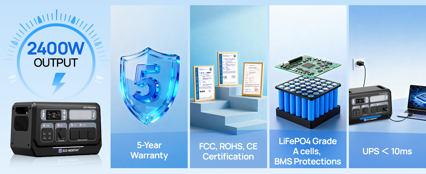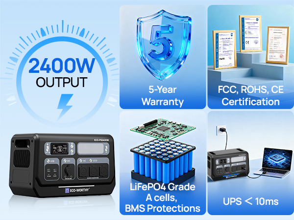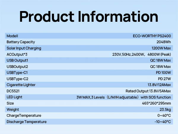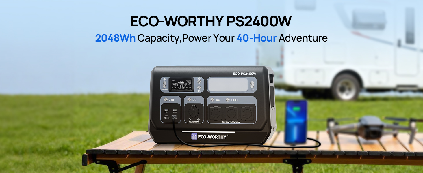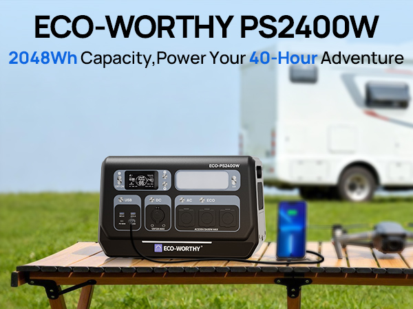 The ECO-WORTHY PS2400W provides 2400W of continuous power and a large 2048Wh capacity, with a peak power of up to 4800W, sufficient to power high-wattage appliances.