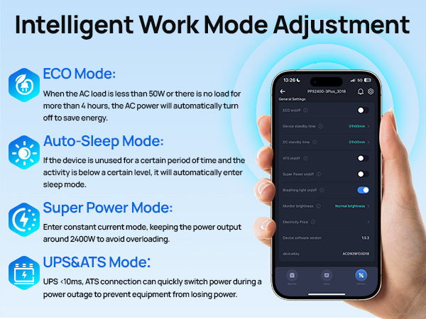 Easily switch between four smart modes: power saving mode, automatic sleep mode, super power saving mode, and uninterruptible power supply (UPS) mode. The UPS mode activates in less than 10 milliseconds, immediately protecting critical equipment during power outages.